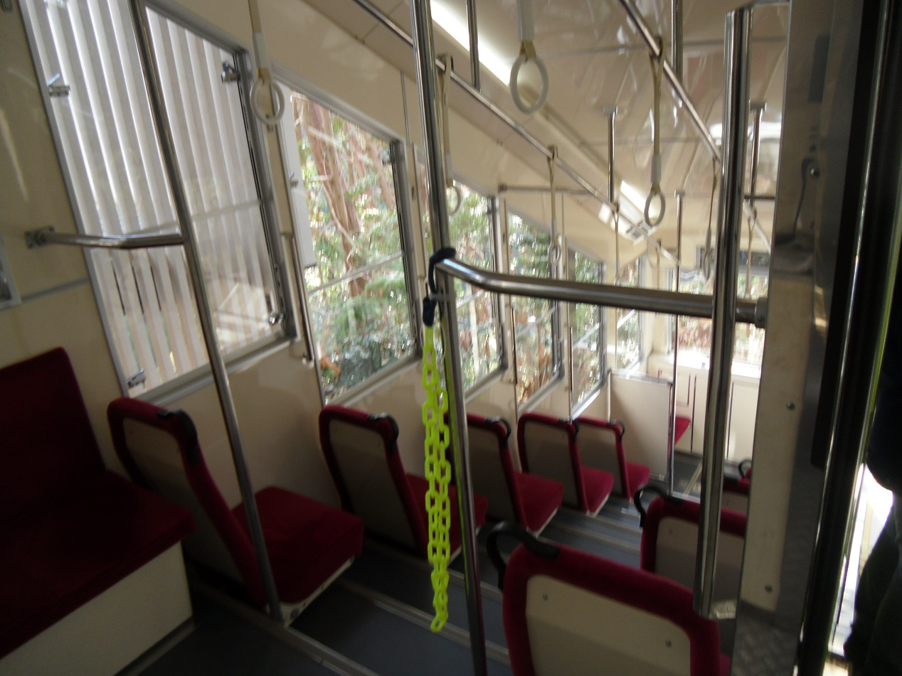 1957年開業と、意外と歴史の長い鞍馬寺のケーブルカー。この車両は2016年以降に運行されている4代目で安全索道製。当初から「牛若號」という名前に変化は無いようです。見ての通り細長い車両ゆえ、定員は少なめです。この4代目車両の特徴は、車内で使用する電源を駅で充電する方式になった事、また、それまでの車両と比べて、天狗のキャラクターが描かれたり色鮮やかになったところでしょうか。せっかく鞍馬寺を訪れたのなら、片道は乗ってみると楽しいかもしれませんよ。
