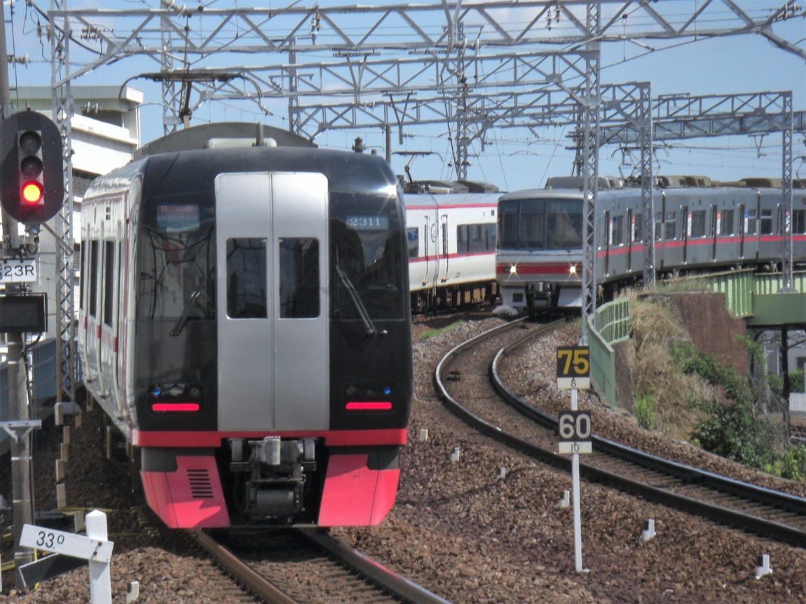 | 3100系(3111F)+ 2200系(編成不明) 名鉄名古屋発車(youtube) 名鉄の特急列車は座席指定2両+一般車4両の1編成が基本となりますが、ラッシュ時はこれに一般車の2両編成が増結されることが多くなります。そのラッシュ時の増結によく-用いられているのがこの3100系で、通勤型と特急型が連結している、という面白い光景を日常的に見ることができます。 |