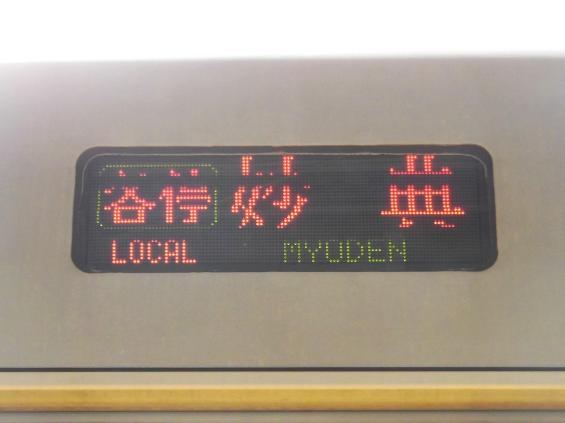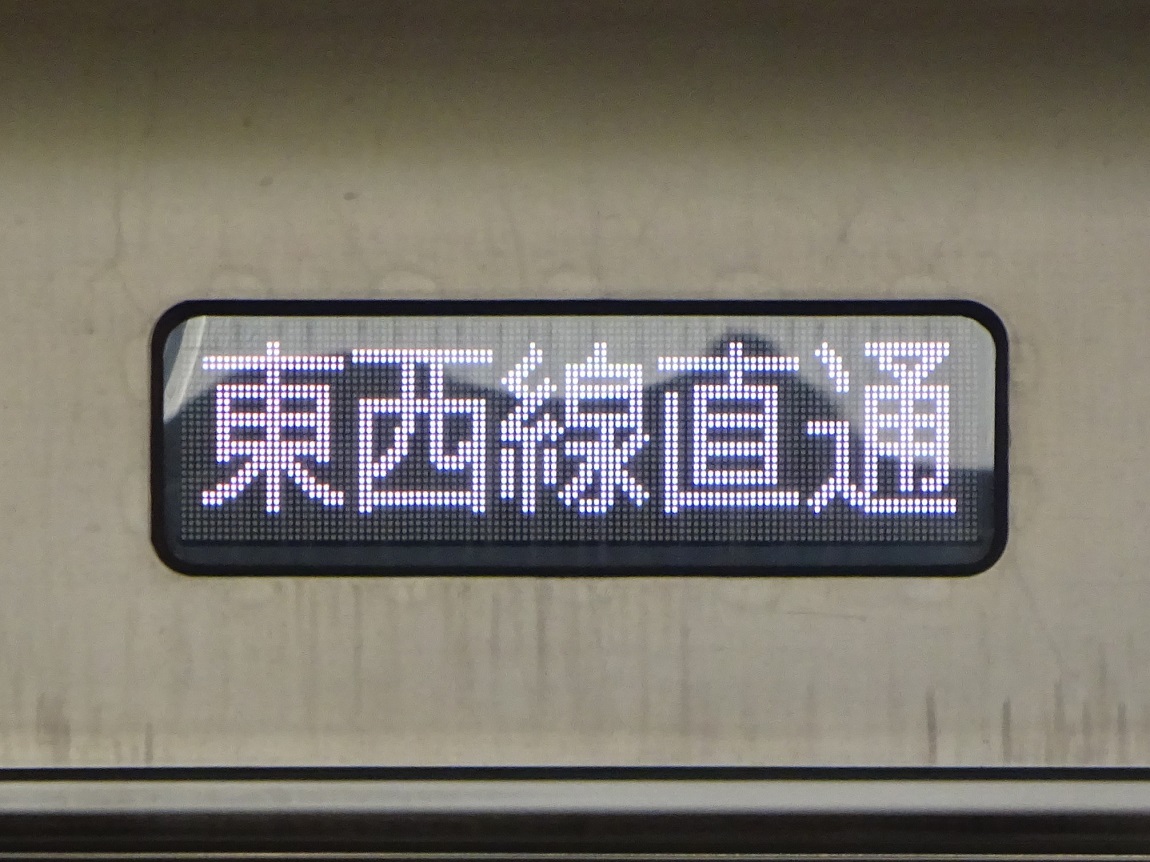 ・07系 扉上LEDの様子 07系のLEDを撮影した、というよりダイヤの乱れによって生じた妙典行きを撮影(もちろん撮影は西船橋)した、というのが本音ですが・・・。基本的に05系(2〜7次車)と表示内容は全く同じですが、表示機そのものの形がちょっと事なっており、端の方が斜めにカットされてます。余談ながら、この列車は妙典到着前に中野だか東陽町だか、その辺りまでの列車に戻りました。 |