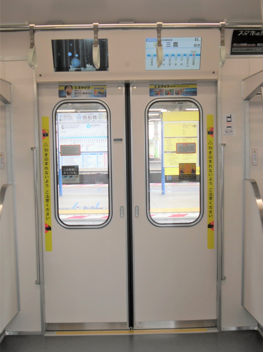 ・07系 ドア開閉 東京メトロではごくごく標準的な形状、動き、音の扉。07系では化粧板が白いため、窓枠の色が目立ってしまっています。 |