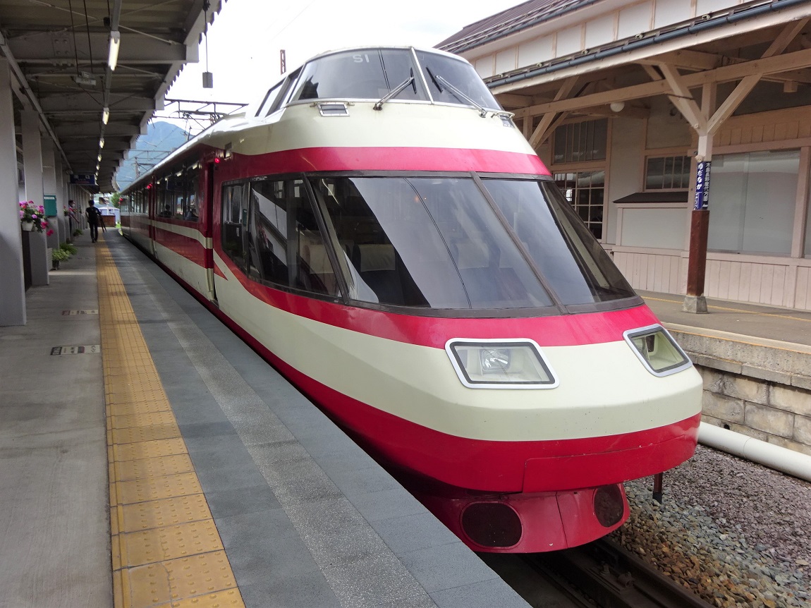・S2編成 権堂発着(youtube) バリアフリーに弱かった事から早々に廃車されてしまった小田急ロマンスカーHiSEを譲受して登場した1000系「ゆけむり」。他の車両と比べて特別な車両である印象が強いからか、時折この車両を使用した、半分観光列車を兼ねた特急が運行されているようです。進行方向逆向きの展望室は自由席となる乗りトク列車でもあります。 |