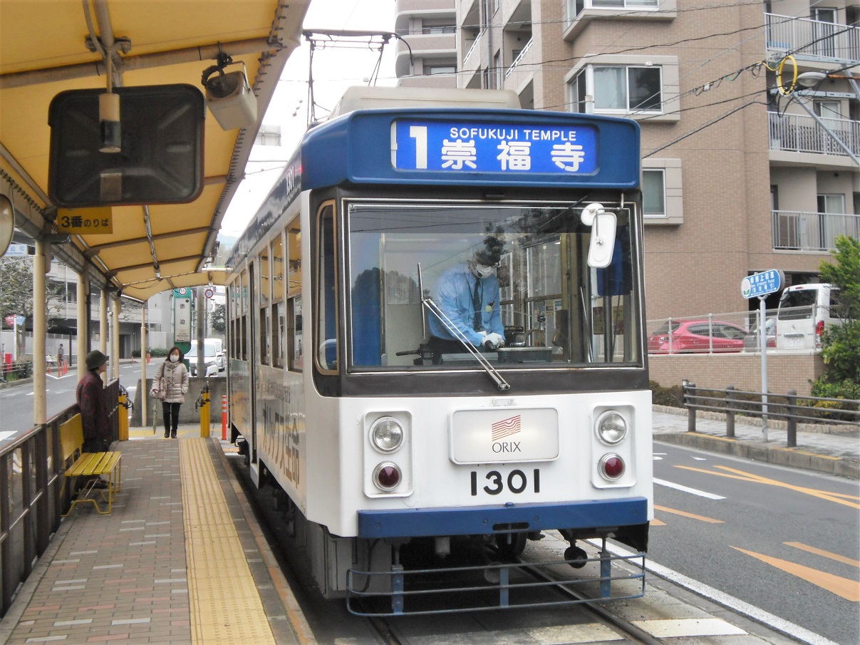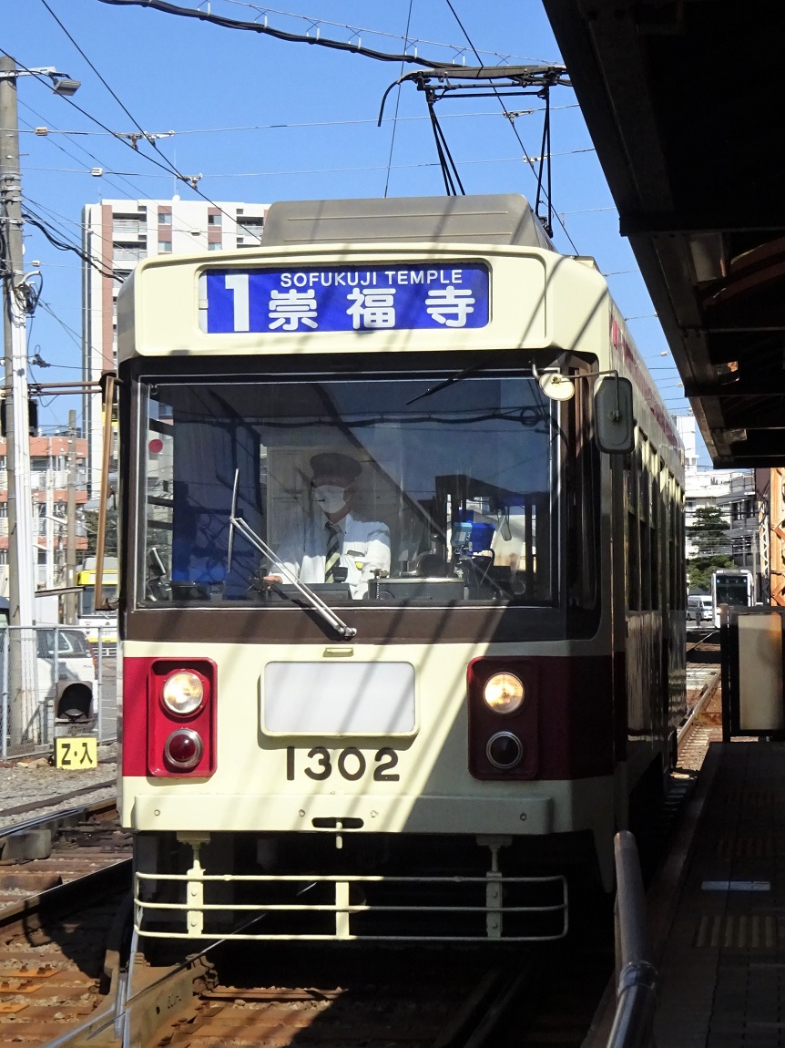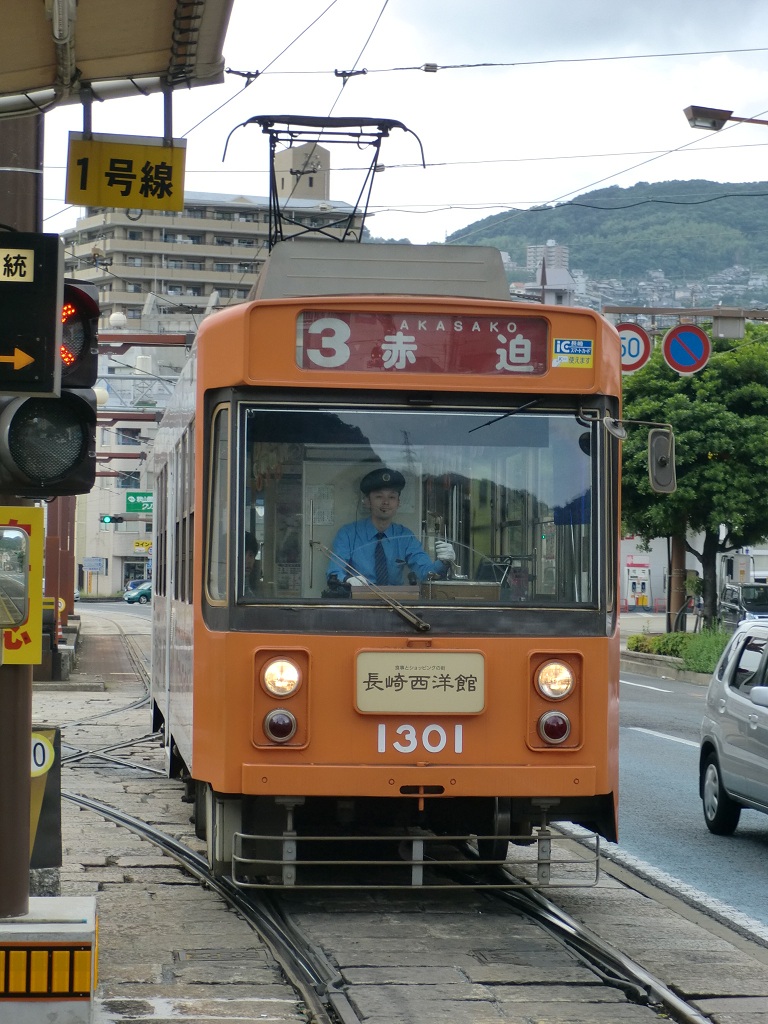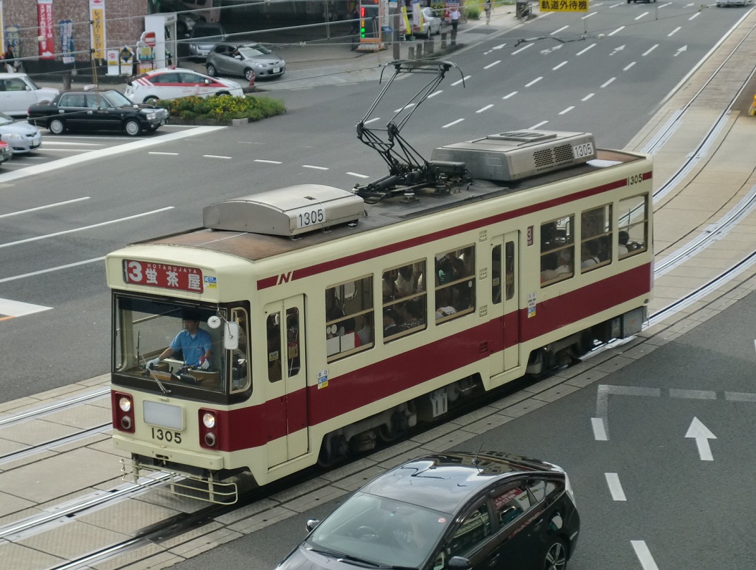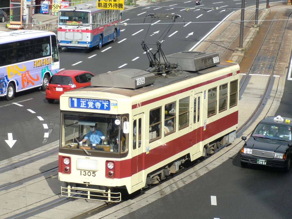 1987年から導入された車両で、基本構造は以前導入された1200形と変わりません。種車は西鉄北九州線の300形で、パンタグラフや車両番号の位置を変更し、車内への手すりの追加などが行われました。 上写真は1301号。浦上車庫前にて。 |