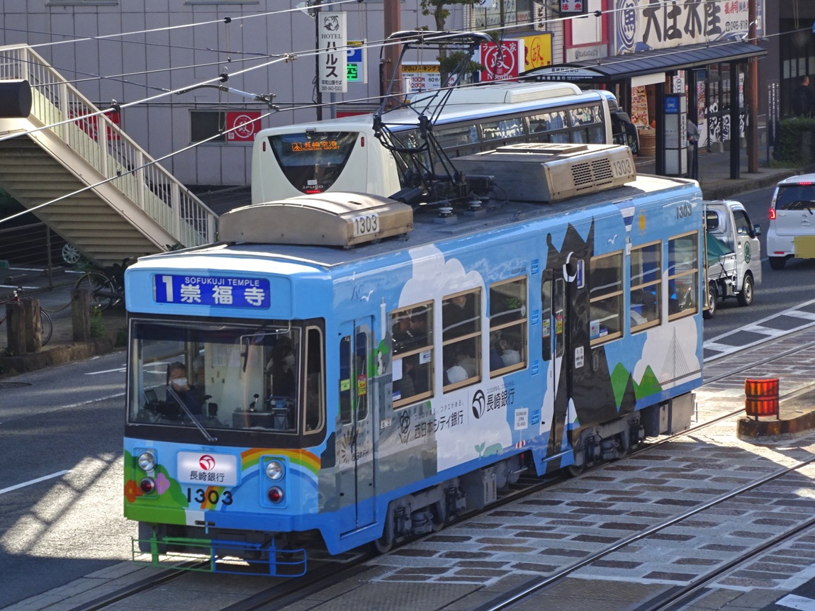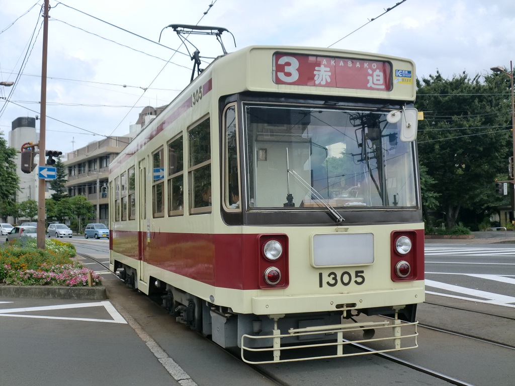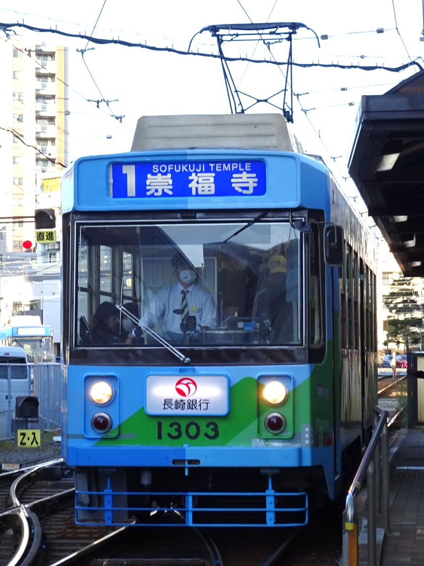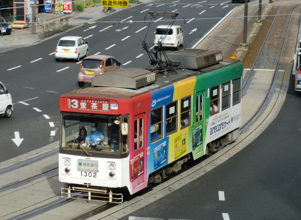 1987年から導入された車両で、基本構造は以前導入された1200形と変わりません。種車は西鉄北九州線の300形で、パンタグラフや車両番号の位置を変更し、車内への手すりの追加などが行われました。 上写真は1301号。浦上車庫前にて。 |