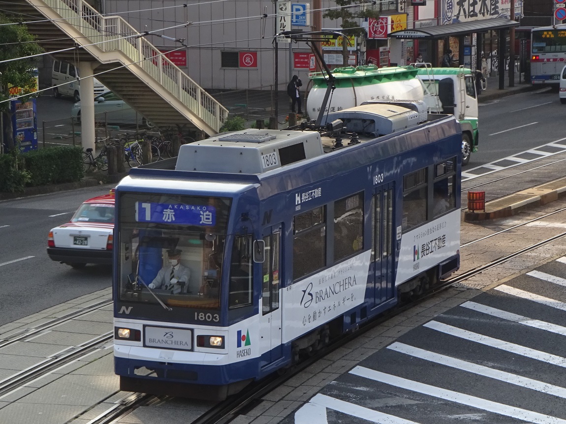 ・浦上車庫前発着集(youtube) 古めかしい車両もまだまだ目立っている長崎電気軌道ですが、吊り掛け式ながら車体は新しい車両や、バリアフリーに対応した新型車両も在籍しています。浦上車庫前で少し待ってみた間に次々やって来た車両を撮影したのですが、最後の5000形以外は全て吊り掛け車です。特に1800形は見た目が近代的なので吊り掛け式である事が意外に思えてしまいます。 本当は5000形だけ映像を分けようとも思ったのですが、モーター音があまりよく分からない映像になってしまったので纏めてしまいました。 |