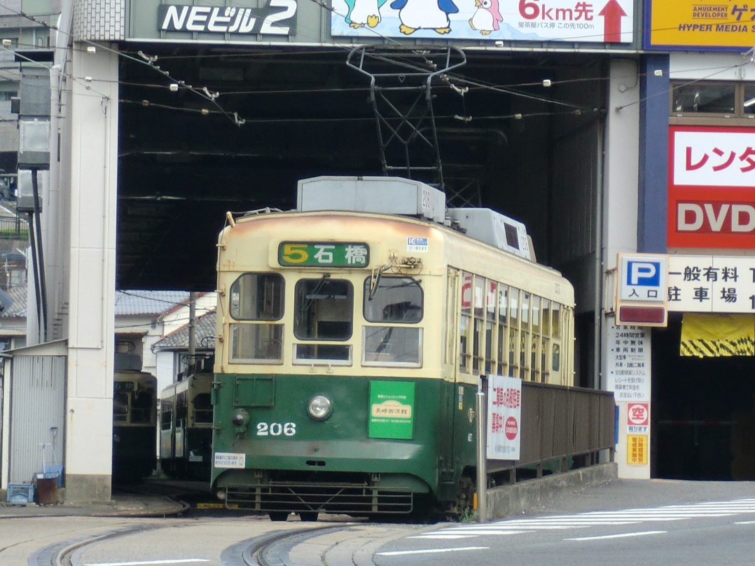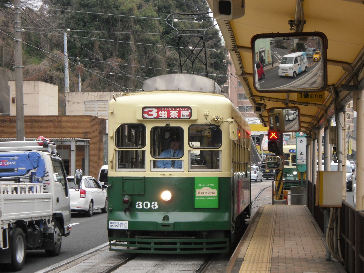 ・浦上車庫前発着集(youtube) 古めかしい車両もまだまだ目立っている長崎電気軌道ですが、吊り掛け式ながら車体は新しい車両や、バリアフリーに対応した新型車両も在籍しています。浦上車庫前で少し待ってみた間に次々やって来た車両を撮影したのですが、最後の5000形以外は全て吊り掛け車です。特に1800形は見た目が近代的なので吊り掛け式である事が意外に思えてしまいます。 本当は5000形だけ映像を分けようとも思ったのですが、モーター音があまりよく分からない映像になってしまったので纏めてしまいました。 |