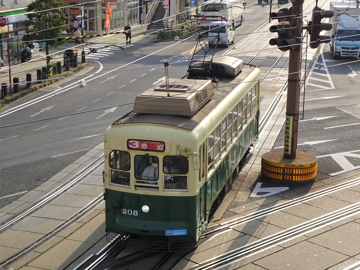 207号はビール電車、おでん電車…等といったイベント運行用に改造(2007年以降)されており、一般の営業には用いられていません。2020年には塗装が改められ「シティクルーズあかり」という愛称も設けられています。 撮影地:浦上車庫 |