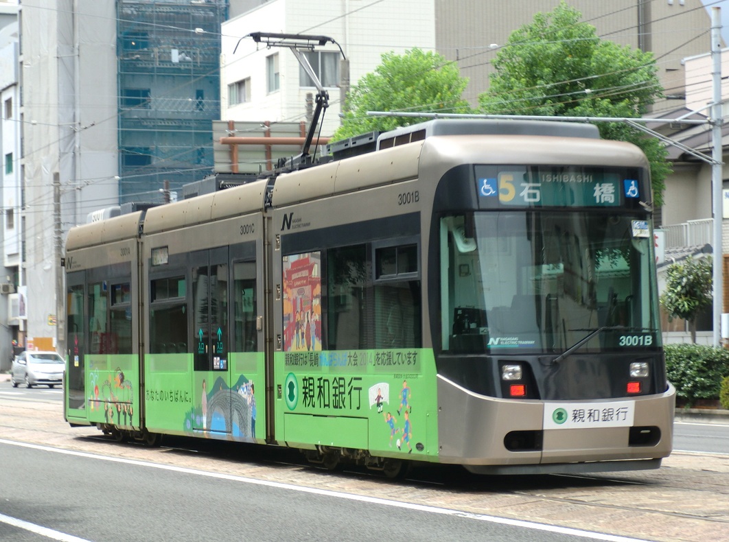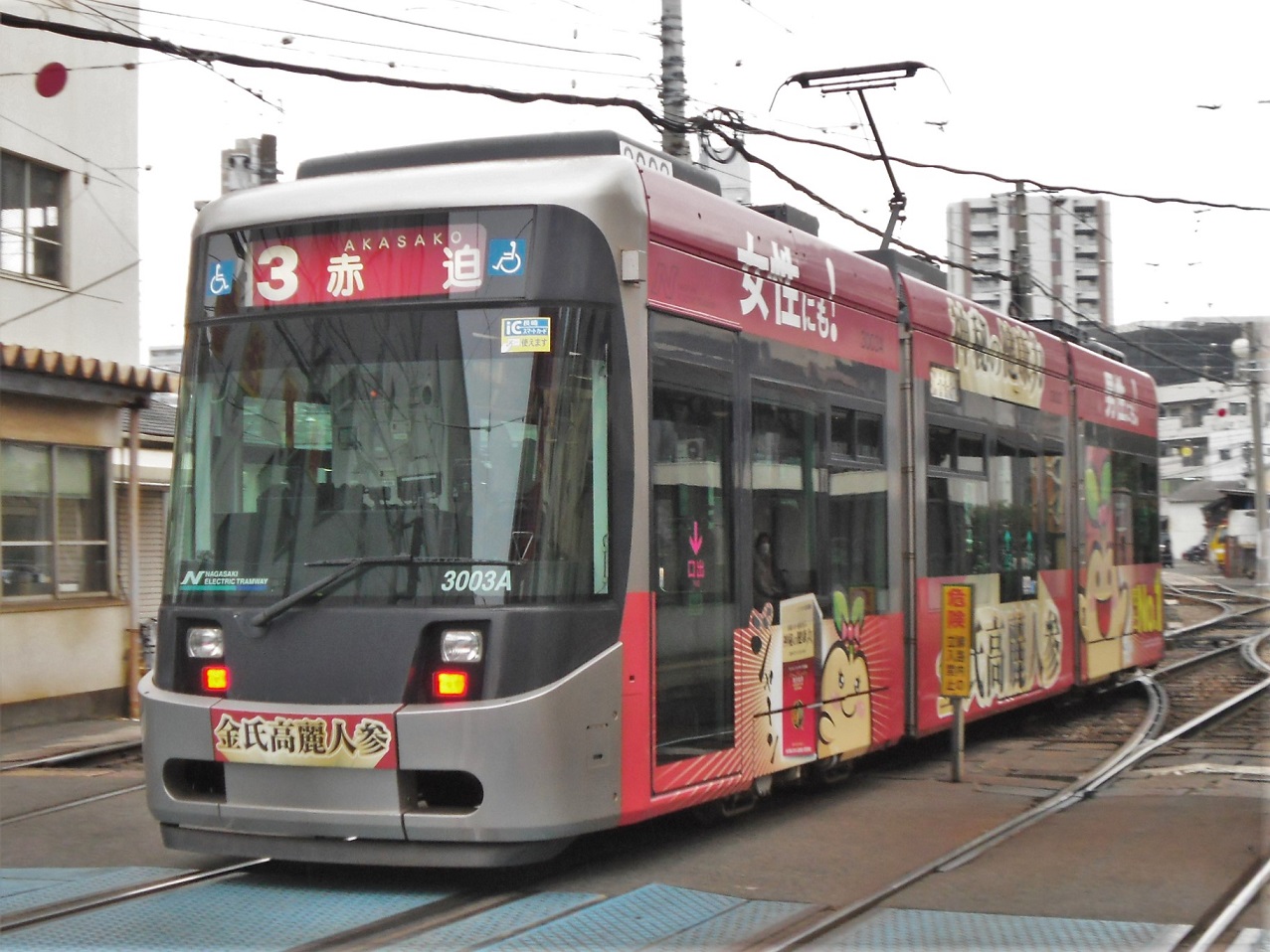 ・3000形走行音 【赤迫支線】赤迫→住吉(49秒:270KB) 走行音自体はよく聞く東洋電機のIGBTなので特別面白い音ではありませんが、ドアチャイムがなかなか変わった音をしています。真ん中の車両には動力がない(というより台車すらない)ので、収録の際はご注意。 |