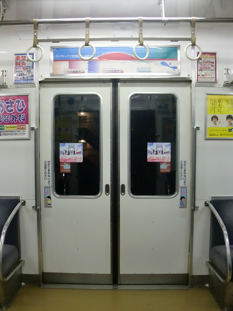 ・2230系ドア開閉(youtube) 南海電鉄の古い車両は扉が開くときに殆ど一気に開き、閉まる時は左右でややズレた動きで勢いよく閉まるのが特徴です。動画の編成はドアチャイムが設置されていましたが、閉扉の時はドアエンジンの音がかなり大きいのでドアチャイムが殆ど聞こえないのは御愛嬌。 |