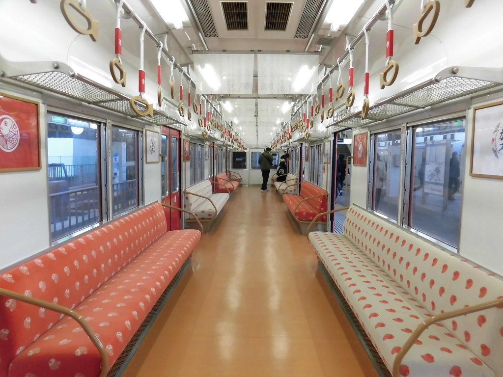 | ・7100系「めでたいでんしゃ」走行音 【加太線】磯ノ浦〜二里ヶ浜(1分58秒:645KB) ワンマンなので自動放送およびドアチャイムがあることを除けば他の7100系と変わりません。ワンマン対応車ならこの2点は設置されているはずなので、特に「めでたいでんしゃ」独自の何かがあるわけではなさそうです。 |