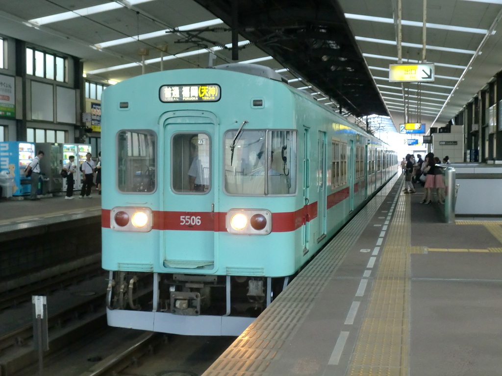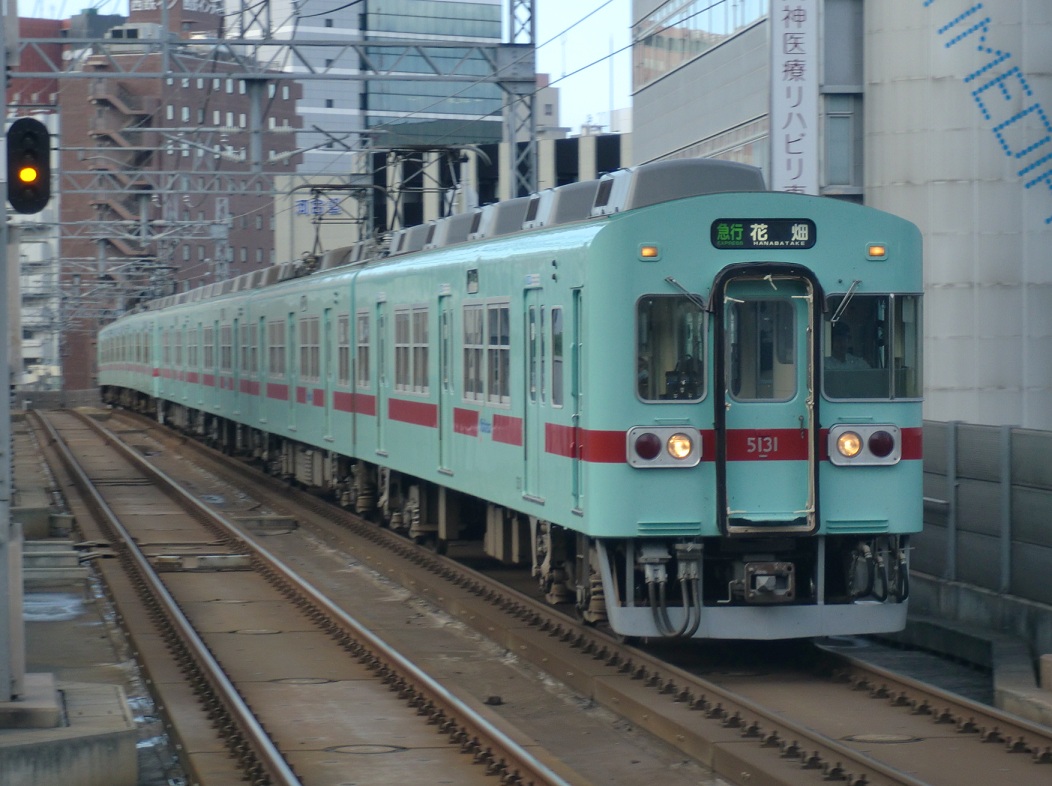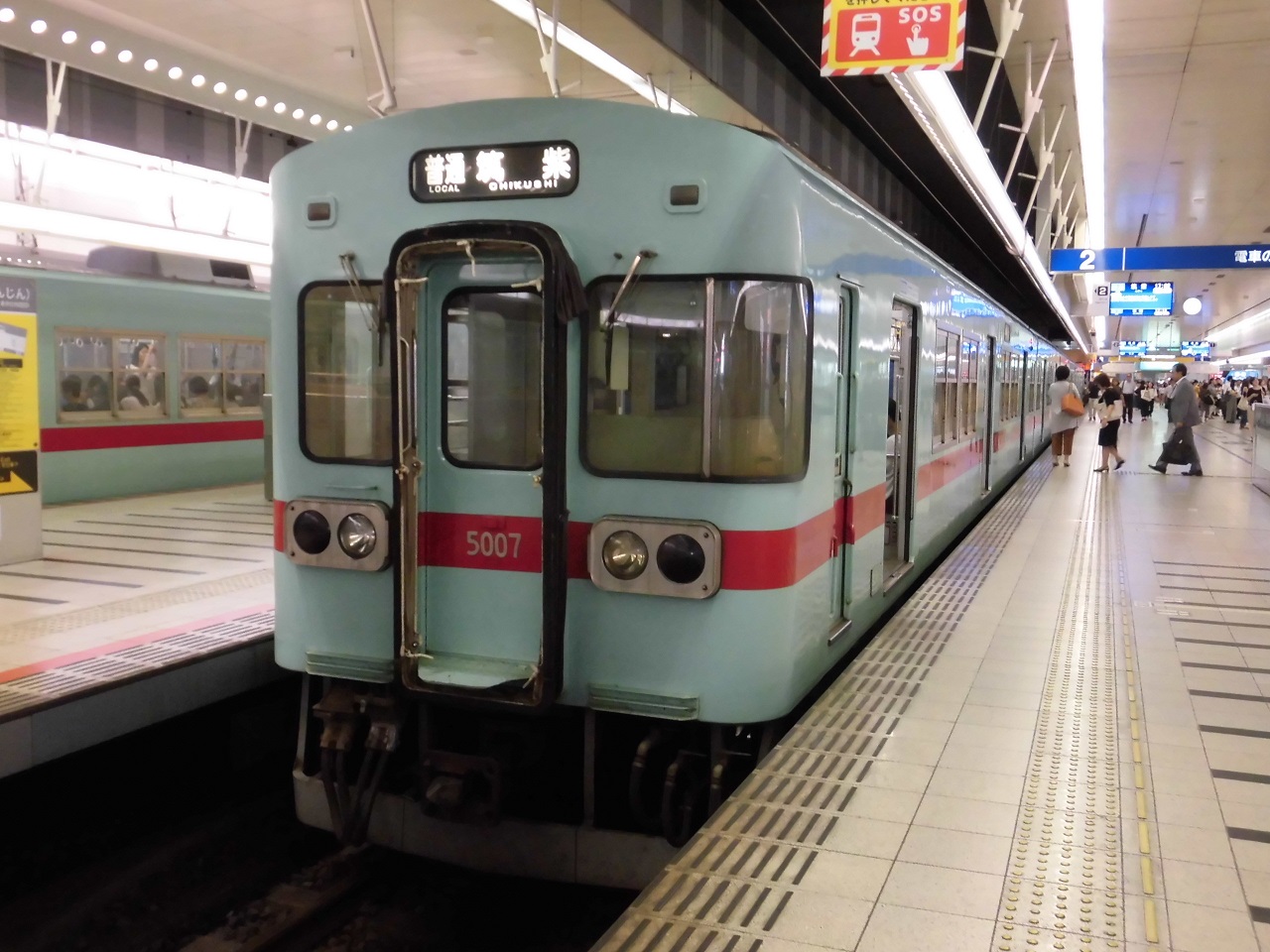 | 5000形(5009F)薬院発車(youtube) 5000形は、西鉄を代表する車両でなおかつ、天神大牟田線の最古参。普通から特急まで幅広く用いられています。非常に多くの車両が在籍しているため、見るのは簡単です。抵抗制御を採用。平成に入るあたりまで増備が続きました。 最古参で除籍もようやく始まったばかり。今しばらくは安心して見る事が出来そうです。 |