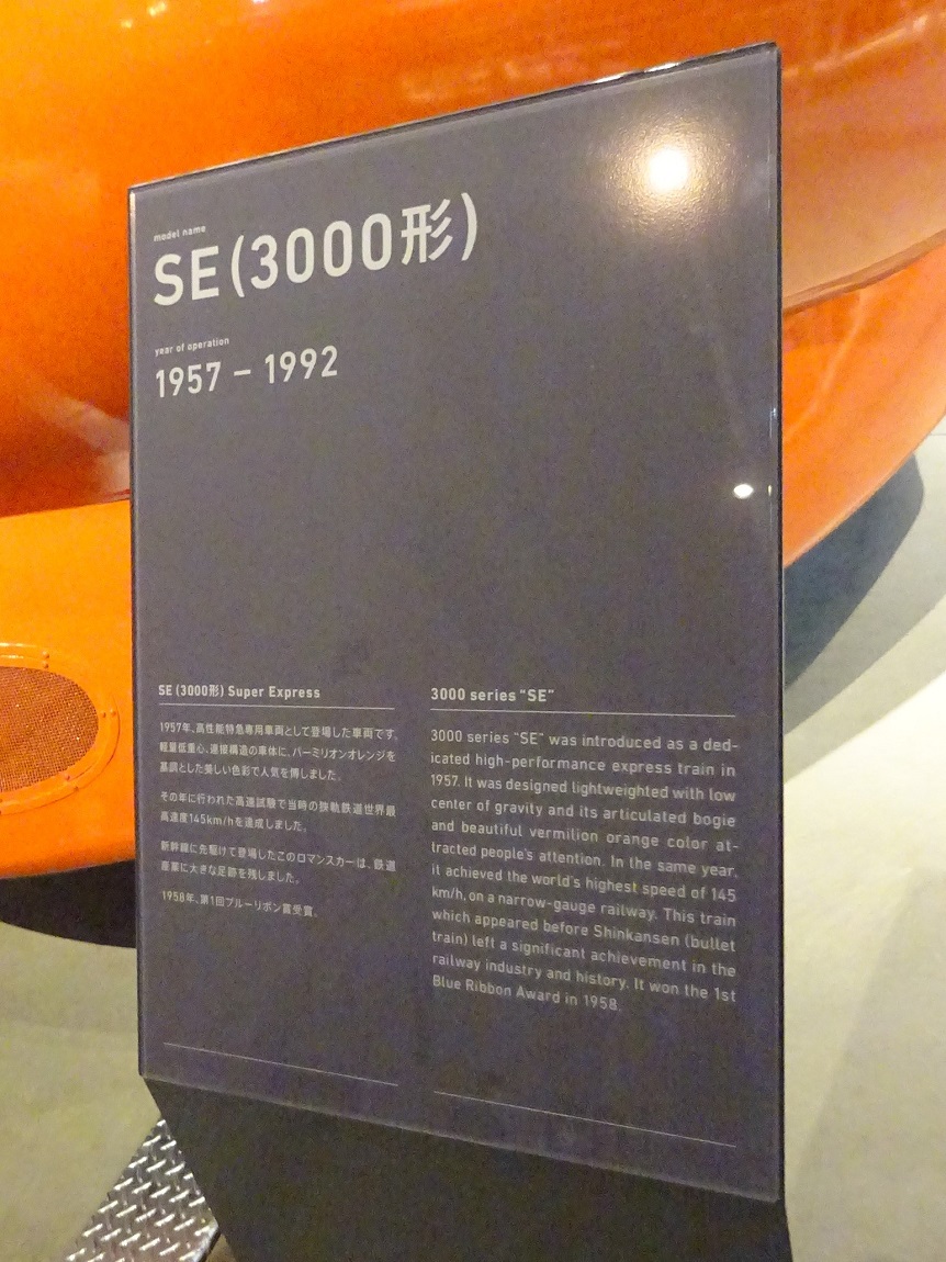 | 上述の通り、SEは第1回鉄道友の会ブルーリボン賞を受賞した記念すべき存在です。当時のブルーリボン賞プレートも現在の物と形状が異なる事が確認できます(車内ではここまで近づけない物の、外から十分覗き込めます)。何気にSE車の保存を見る上で一番といって良い位重要な物なのではないでしょうか。 撮影場所:ロマンスカーミュージアム |