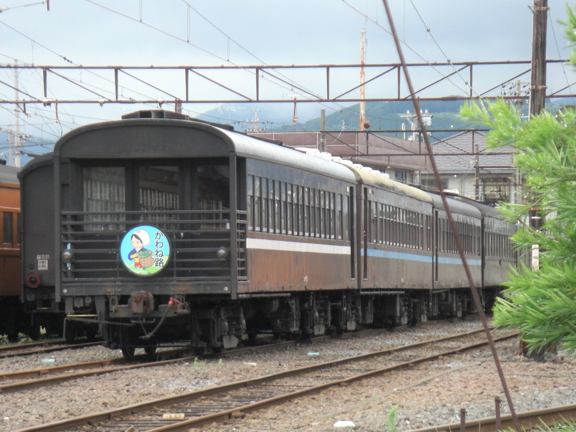 1982年、西武鉄道のサハ1515を譲り受けて大改造を施し、展望車として導入した車両。ナロ80形同様、塗装を他の旧型客車の物に合わせているものの車体断面が旧型客車とは全く異なっている為、異彩を放っています。窓下には一等車を示す白帯が設けられており、展望構造共々、国鉄に在籍していたマイテ49形展望車などをモチーフとしたようです。