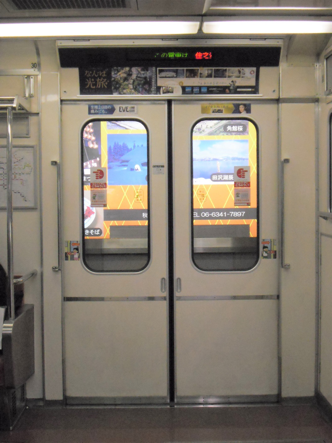 | ・23系ドア開閉(youtube) 大阪市営と言ったらこのドアチャイム。開扉時のチャイムは、列車が停止する直前にも流れています。関東地方だと京急が運行している羽田空港内循環バスのドアチャイムがこれと同じものだったりするので、大阪が恋しくなったら羽田に行けばいいんだと思います。 |