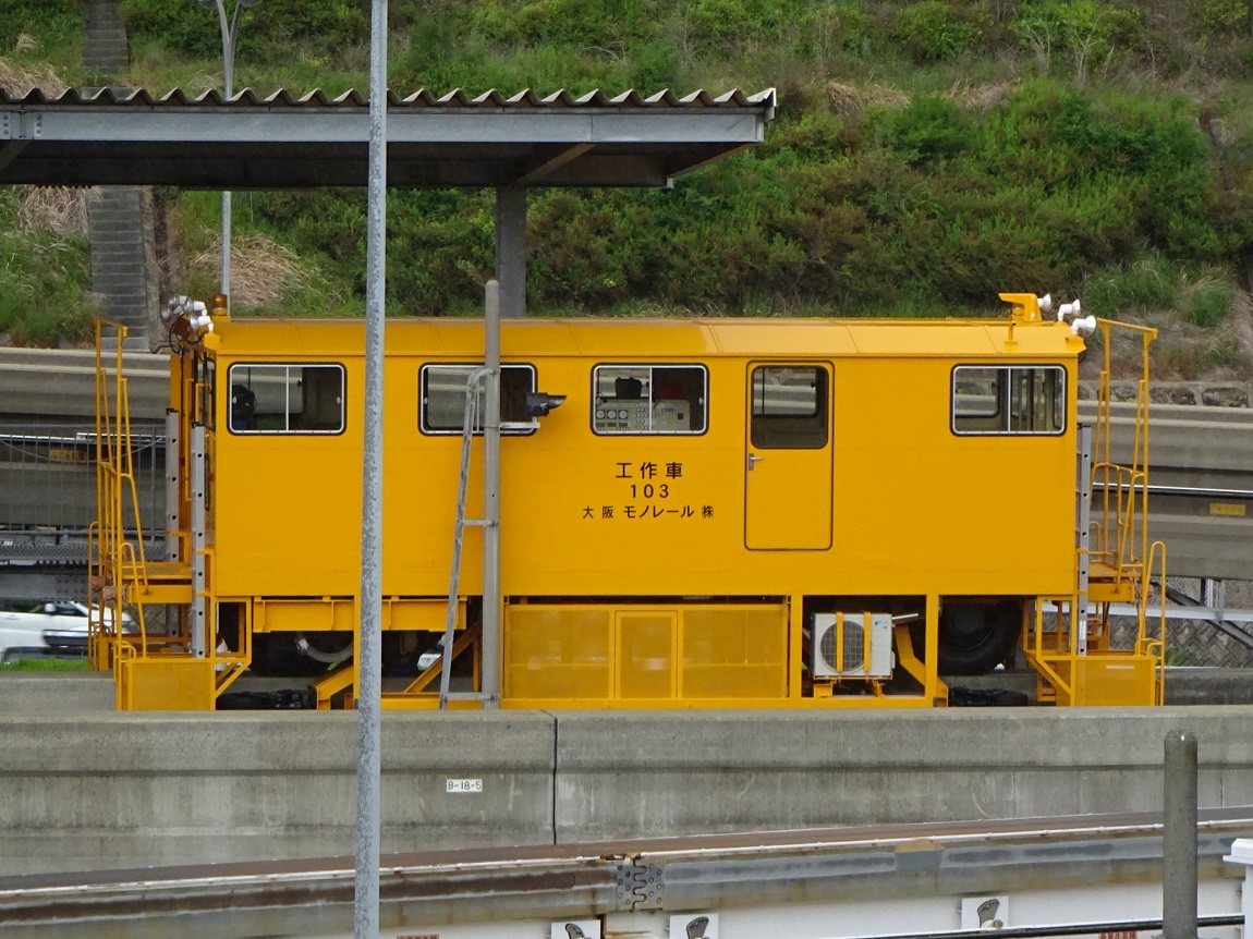工作車(1) 102号車。何もなければ万博記念公園駅付近の車庫で外から見える場所に留置されています。 左写真は万博記念公園にて。 |