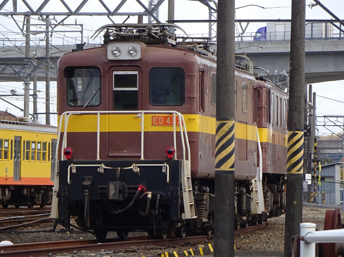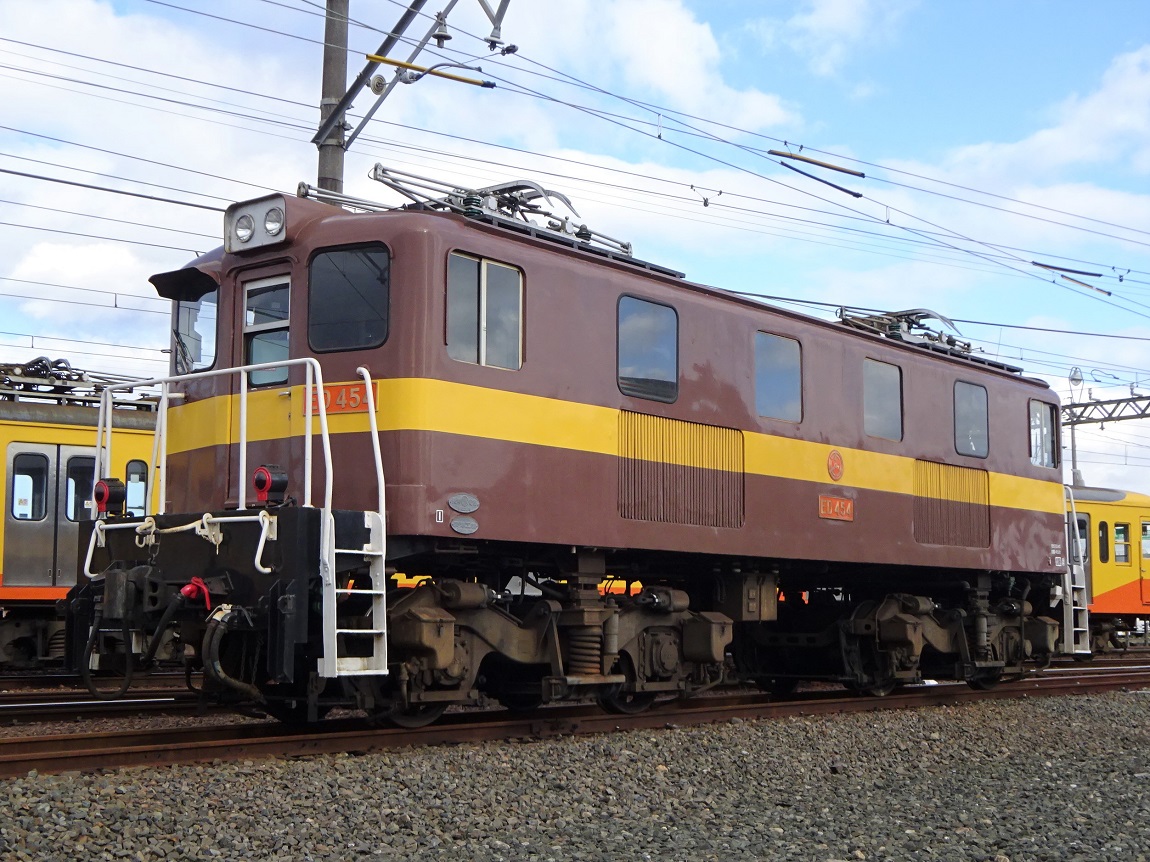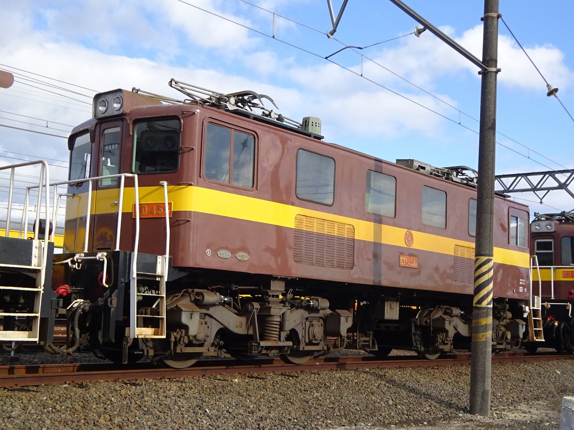 1954年から導入された機関車で、重連でセメント輸送列車の牽引に用いられています。ED458とED459は東武鉄道の出身で他の車両とは見た目もやや異なるのですが、一緒くたにED45形として用いられています。 上写真は保々にて。 |