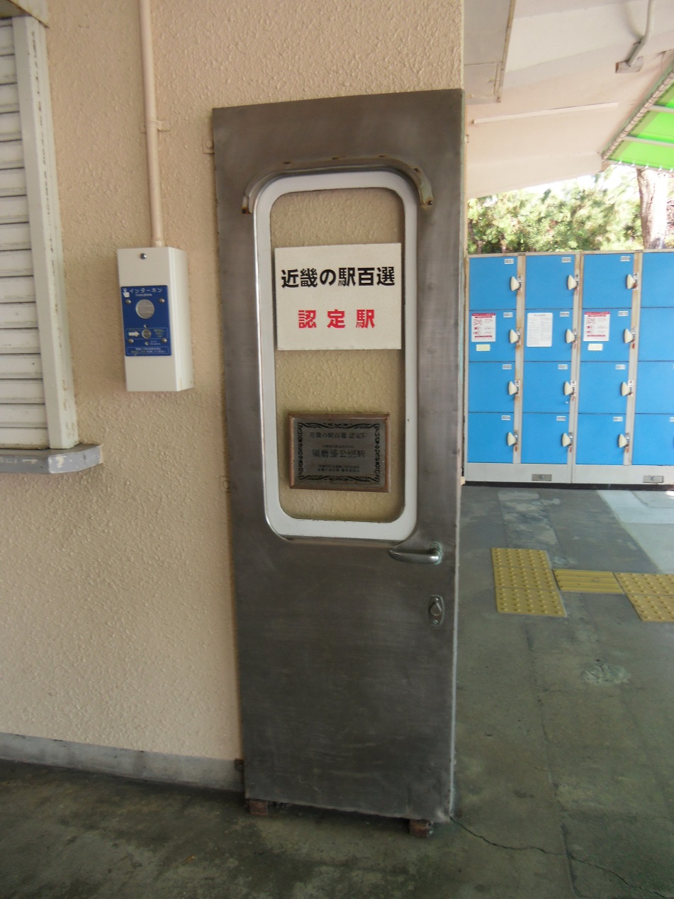 ドア 須磨浦公園駅の「近畿の駅百選認定駅」のプレートが収められている部分…が、何故か廃車発生品の扉でした。2000系なのか3000系なのか。プレートが痛まないように囲おうとしたときに、ちょうどいいサイズだったのかもしれませんが、何だかシュールですね。 |