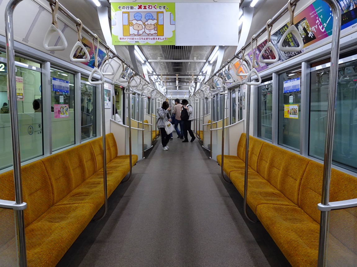 ドアに注意のステッカー。他の路線とは異なるものが用いられていますが、実はこれは昔の札幌市営地下鉄の同ステッカーでお馴染みだったデザインで、超巨大(誇張抜き)に扉に貼られたこのキャラクターはインパクト抜群を通り越して少し怖い程でした。そのキャラクターが復活したことでちょっとした話題になった様です。詳しくは「札幌市営 いたいよ〜」で検索すれば出てきます。 撮影地:車内にて |