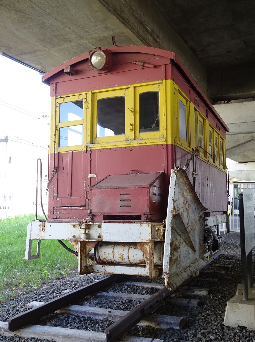 いわゆる「ササラ電車」の一族ではありますが、この車両はプラウ式の除雪車。要するに大きなソリのようなものを付けた車両とでも言ってしまえば話は早いでしょうか。この車両はササラ電車のように行きを跳ね飛ばすのではなく、押し分けて進む方法を取っていました。スノープラウがついているもののデザインとは無縁な小屋みたいな形のこの車両、登場はなんと大正9年。これからも大事にしていただきたいものです。