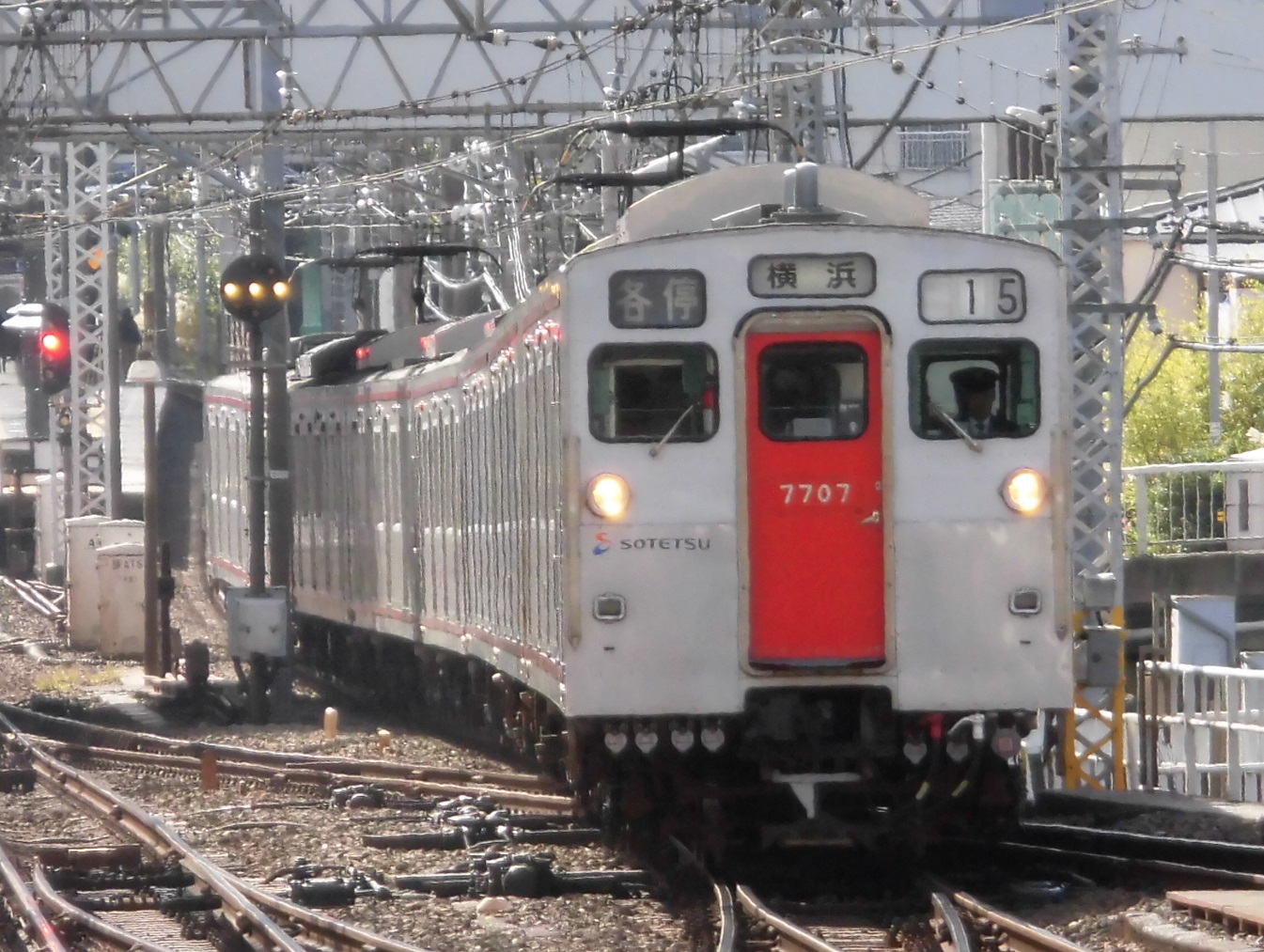 1975年に、新6000系の足回りに2100系などをベースとしたアルミ車体を乗せて登場した車両。2100系や5000系と比べて、ライトが端に寄っているのが見た目上の違いです。他にも違いはありますが細かいので割愛。ある程度製造されたところで一度製造を終了。1985年の製造再開時には大きくマイナーチェンジが施され、「新7000系」と呼ばれることとなりました(別ページで公開)。 11000系の投入で置き換えられる予定となっていましたが、計画の変更が生じたのか、細々とした勢力ながら11000系の投入後も残り続け、最終的にはJR線との直通が始まる頃とほぼ時を同じくして12000系により置換えられて引退しています。 上写真は7708F、天王町にて。 |