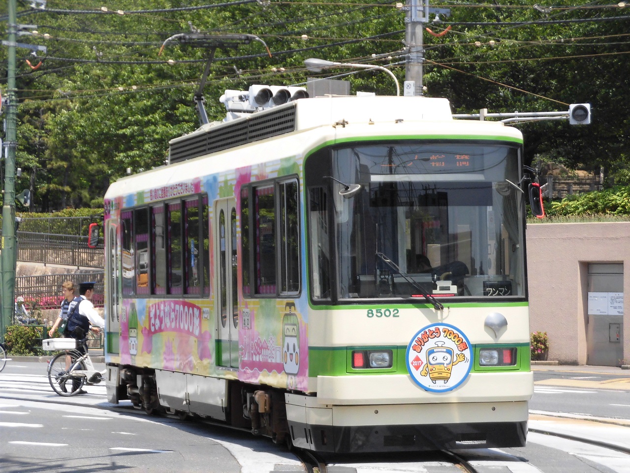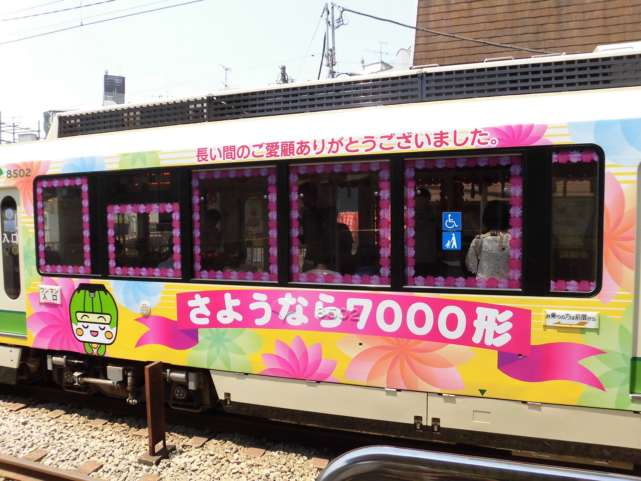 2017年、7000形が引退する際、それを告知するラッピングが何故か8502号に施されました。引退すると言っておきながら肝心な張本人たちがなかなか運用に入らないからこのような措置を取ったのだとは思いますが、これではまるで8500形が引退するみたいではないですか。不思議で違和感のあるラッピングでした。