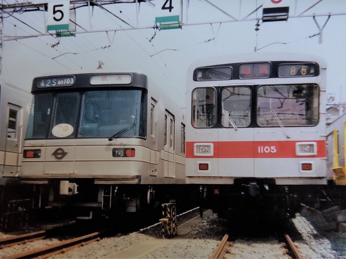 7000系に代わる地下鉄日比谷線直通用車両として1988年に登場した車両。基本的には9000系をベースにしていますが、日比谷線直通用ということから18m3扉に設定されています。簡単に区別できるようにするための配慮か、前面上部分に黒い塗装が施されています。 また、1000系は7200系の置き換え用に池上・多摩川線にも導入。こちらでは後継の7000系(2代目)の登場により、一部編成が地方私鉄へと譲渡されています。 その後、日比谷線との直通運転の中止に伴い、直通用に用いられていた1000系は3両に短縮&改造の上池上・多摩川線に導入された他、一部が上記と同様に地方私鉄へと譲渡されています。 上写真は1003F。北千住にて。 |