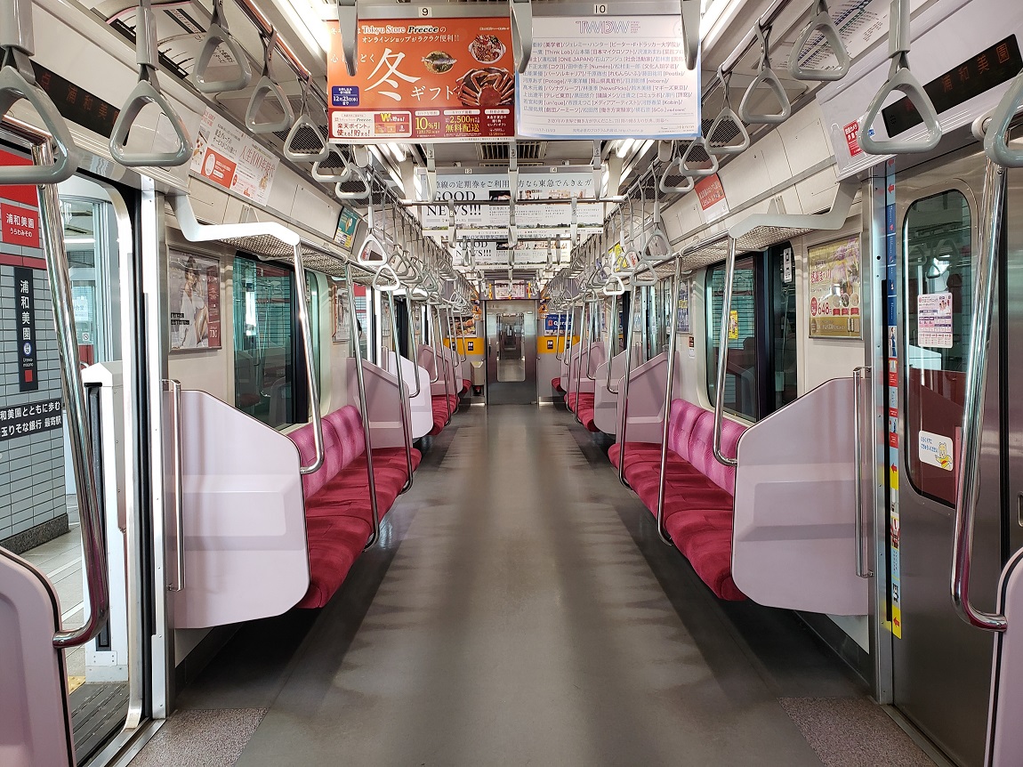 此方、5189Fと5190Fの8連化の際に組み込まれた元6000系の車両の車内の様子。6000系当時と何も変わっておらず、他の車両とは色彩が大きく異なっています。車体も共通で、モーターも5080系と6000系で大した差が無い事からこの転用が出来たのでしょう。こうして、趣味的な沼は大きくなってゆきます…。 撮影地:浦和美園停車中にて |