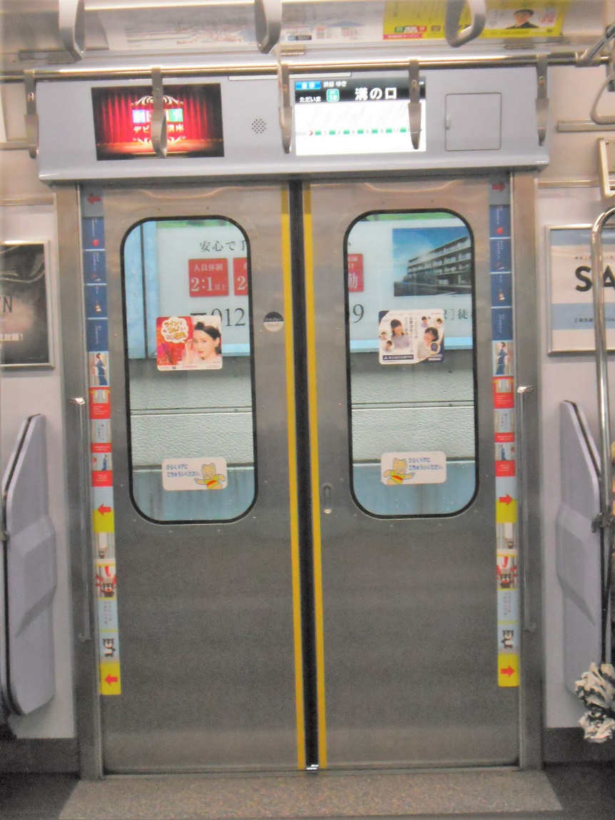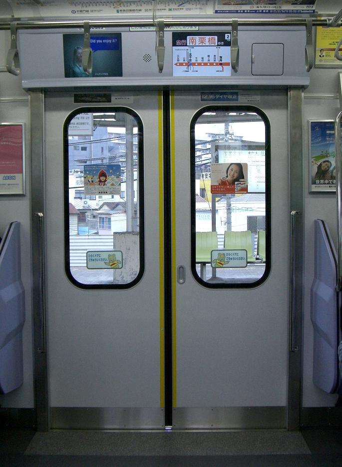 5000系(〜5010F) ドア開閉(youtube) 導入当初の5000系は接着窓の無塗装扉。近年、警戒帯(黄色のテープ)の貼り付けが進んでいるようですが、未だに貼っていない編成もあるにはあるようです。 |