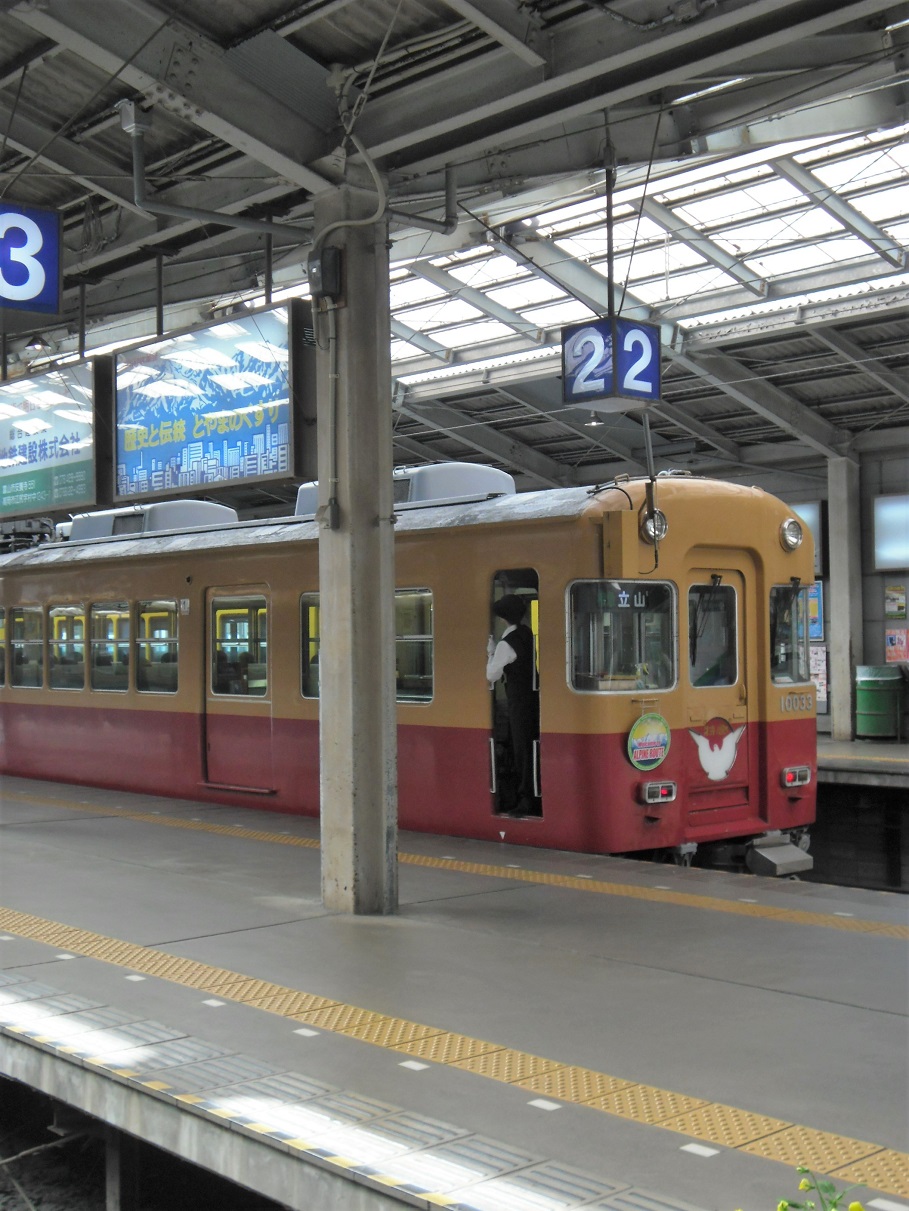 | ・10030形ドア開閉(youtube) 10030形は京阪3000系を譲り受けて導入した車両で、同社の主力車両。今後ダブルデッカーを譲り受けて観光列車を導入することが決まっています。 富山地鉄の車両に多い大きなドア番号表示が設置された(というより塗装された)事と、ドアが閉まる前ににぎやかなブザーが流れるのが、3000系からの変更点と言えそうです。 |