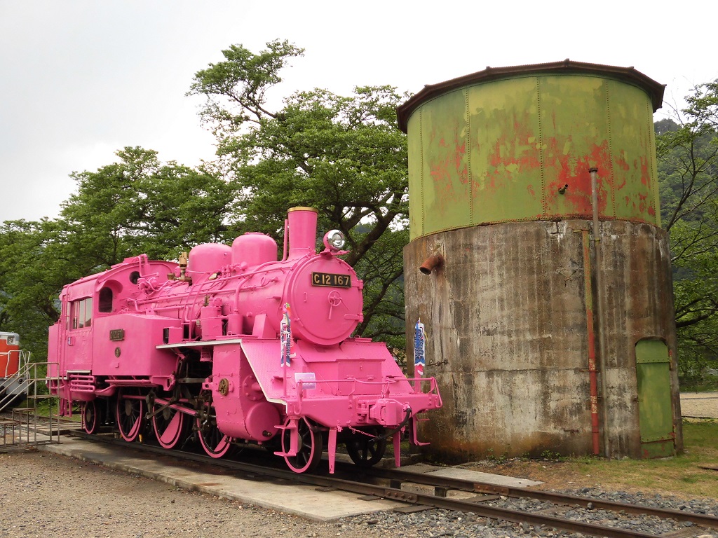 若桜駅に設置されているSLの遊具もちゃんとピンク色になっていた(こちらも子供の日周辺だけなのか通年なのかは不明)のですが、C12タイプが存在していないのかC57タイプで代用されています。