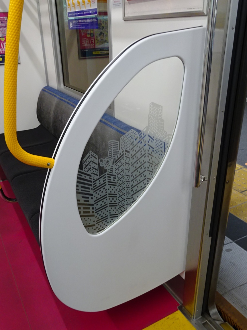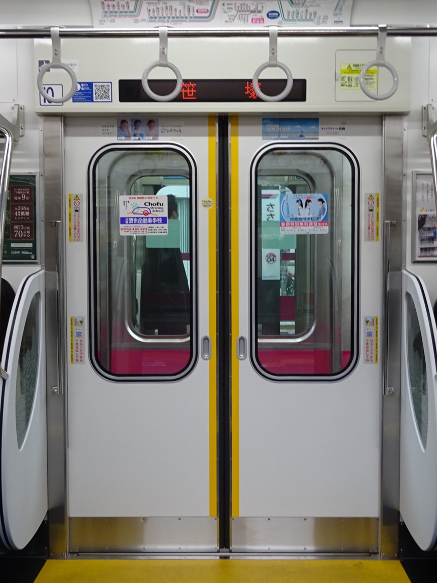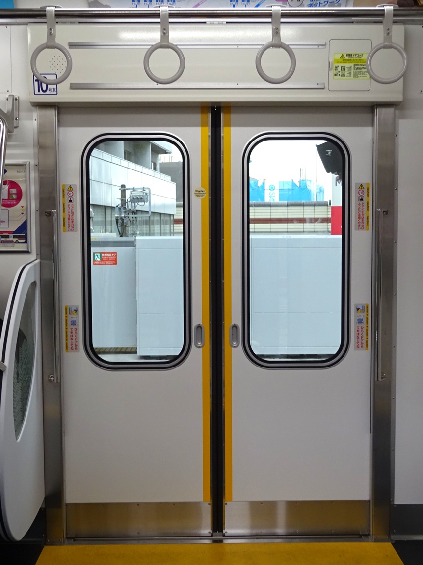 ・9030系前期車ドア開閉(youtube) 都営新宿線直通対応の10両固定編成となる9030系のうち、初期の車両は扉の取っ手の位置が中央によっているため、黄色いテープが途中で途切れると言う変わった見た目になっています。また、扉上の案内表示がLEDなのも標準的な9030系と違う点ですね。 |