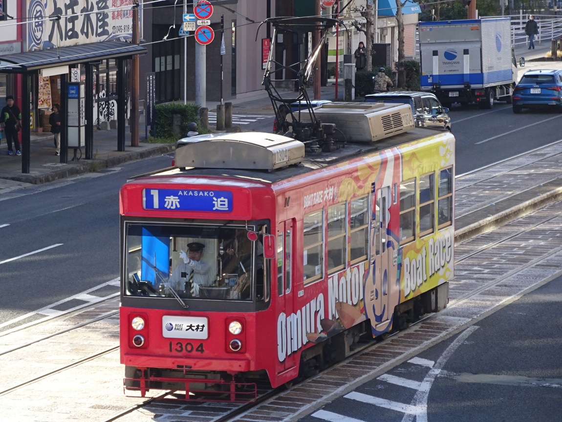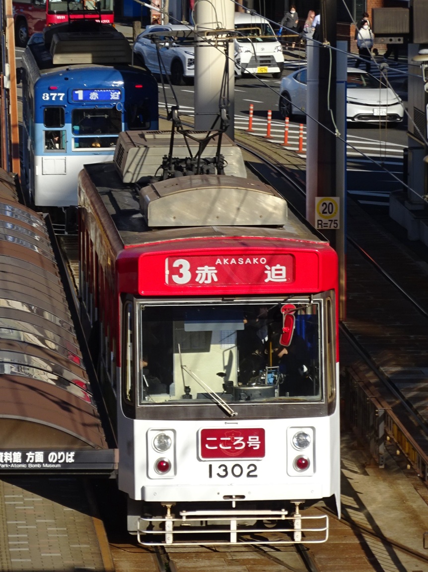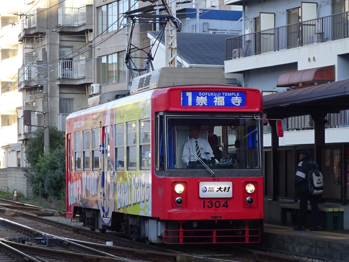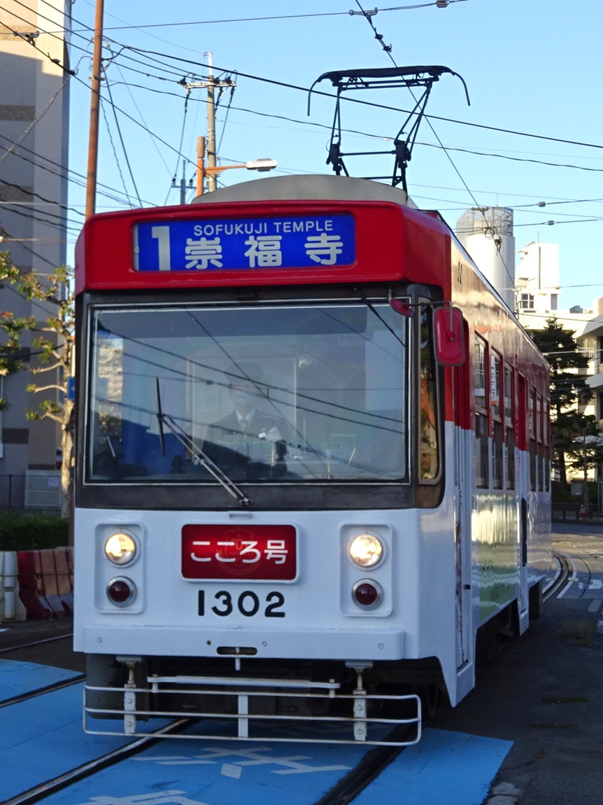 1987年から導入された車両で、基本構造は以前導入された1200形と変わりません。種車は西鉄北九州線の300形で、パンタグラフや車両番号の位置を変更し、車内への手すりの追加などが行われました。 上写真は1301号。浦上車庫前にて。 |