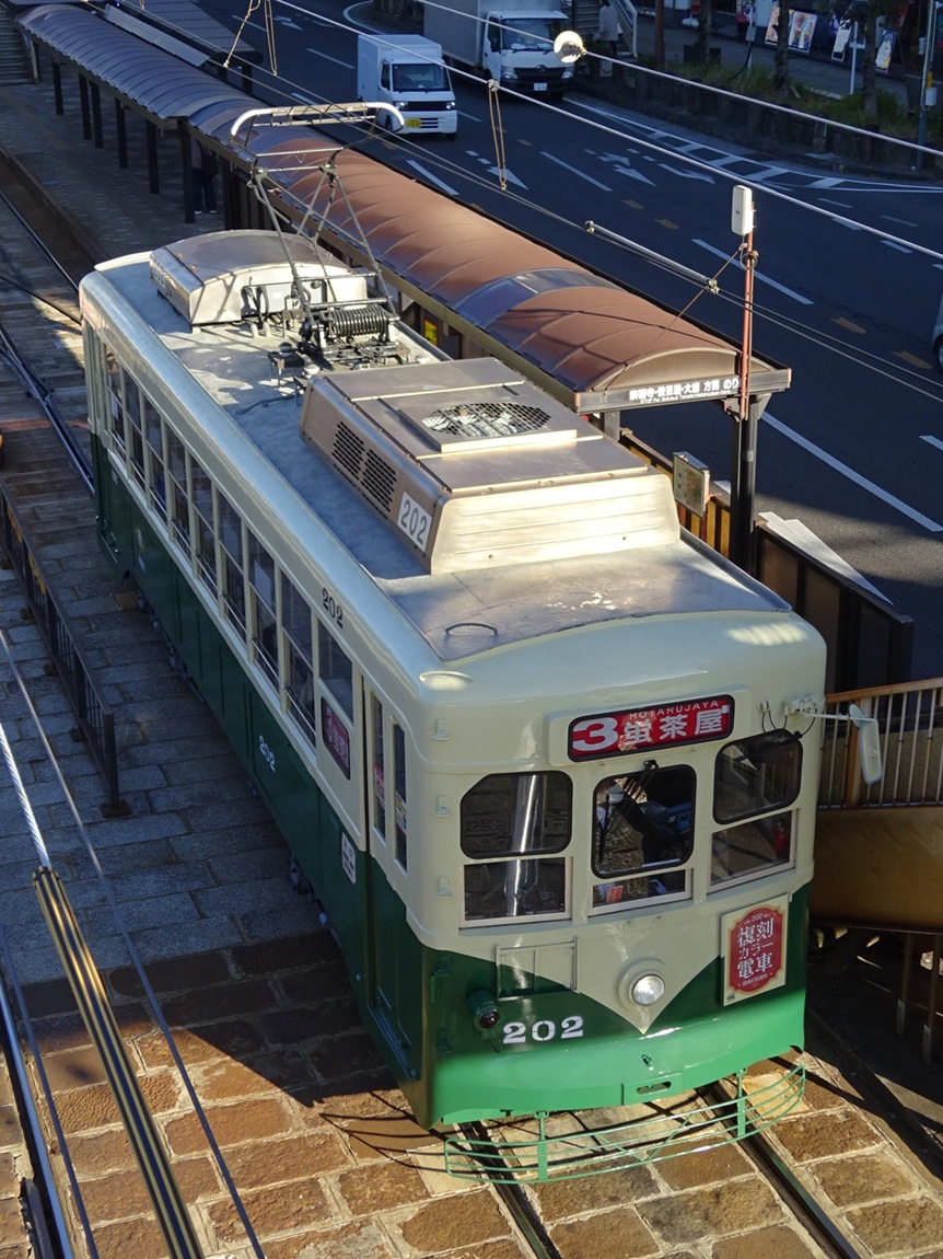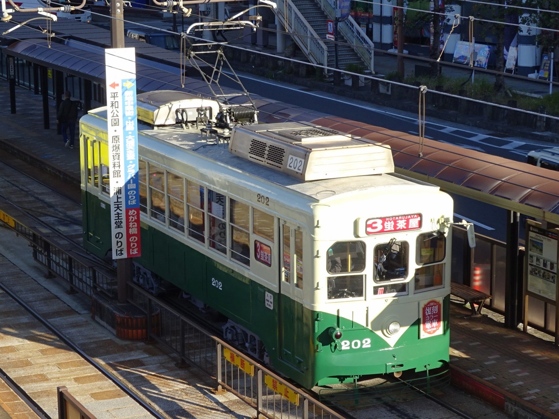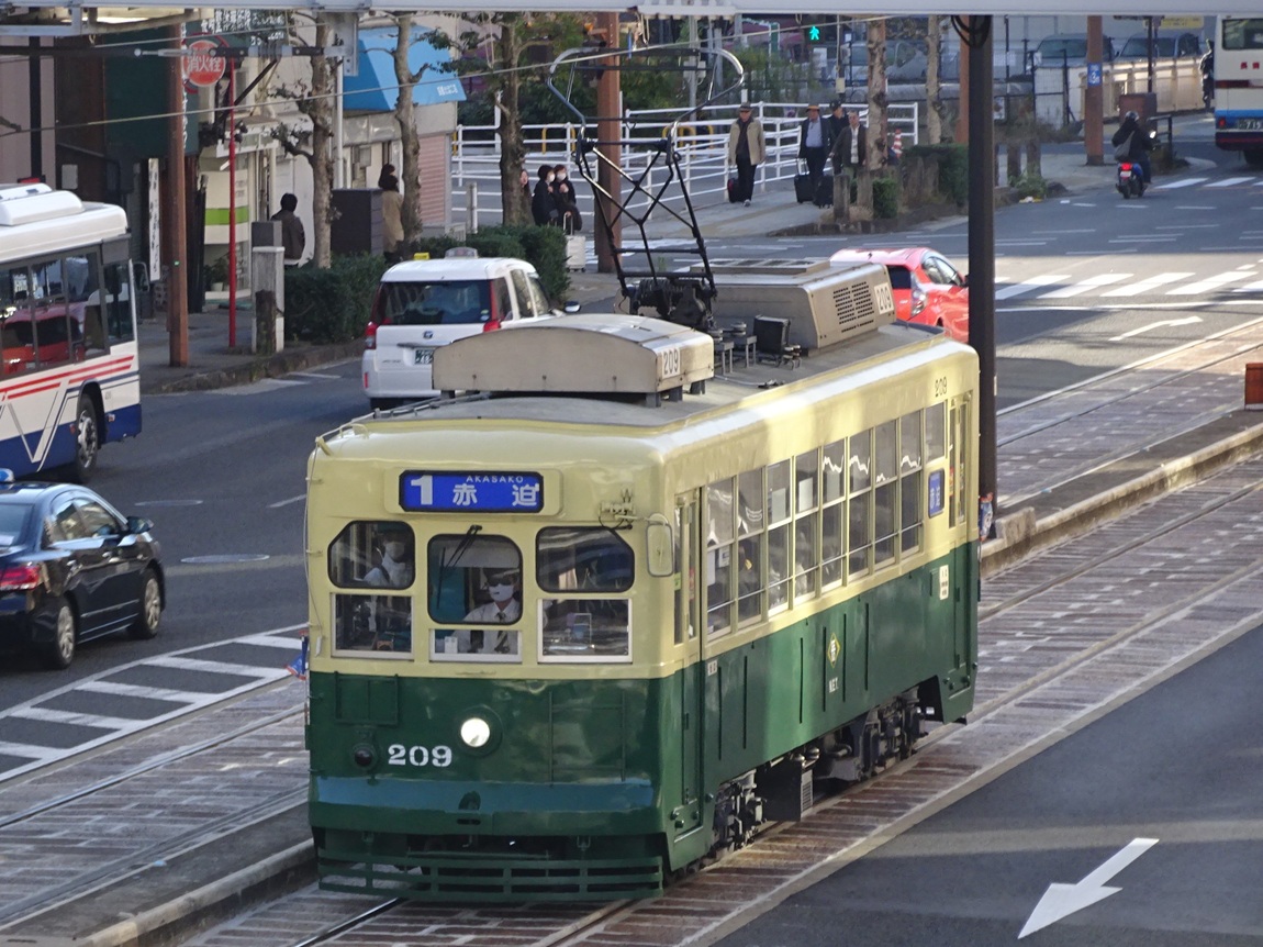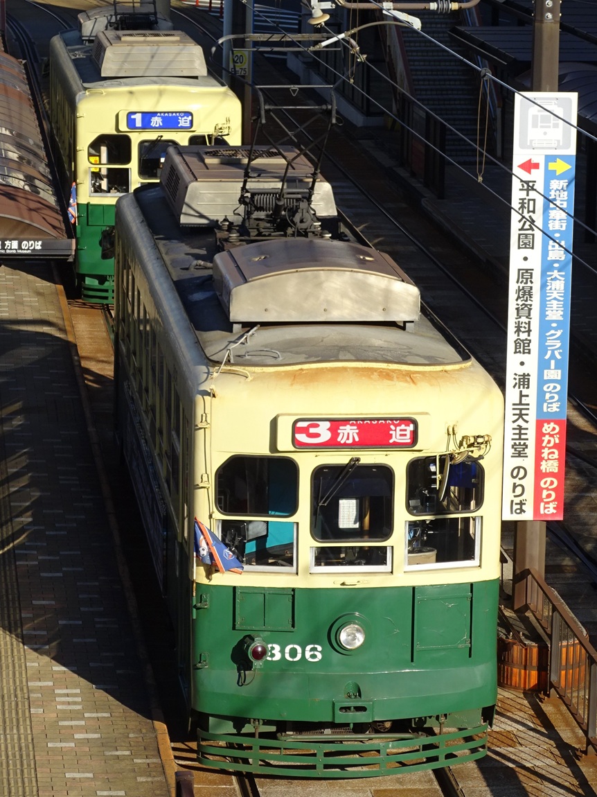 大橋〜住吉の延伸を控え、輸送力増強が必要になった事から1950年に登場した200形は、長崎電気軌道にとって初のボギー車となりました。細かく分けると4形式に区分され、登場から60年以上経過した今でも長崎電気軌道の主力車両として運行されています。以下、形式ごとの説明を。 201形…1950年から製造されたグループで、日立製作所製。電装品や制御装置は三菱電機製。 202形…同じく1950年から製造されたグループで、日本車輛製。電装品や制御装置は三菱電機製。201形と異なり、ウィンドシル・ヘッダーがあるため、そこが違いとなります。 211形…1951年に導入されたグループで、日立製作所製。電装品や制御装置は日立製作所製。201・202形と比べて台車の吊りリンク機構が改良されています。 300形…1953年に導入されたグループで、日立製作所製。電装品や制御装置は日立製作所製。台車ごとにブレーキシリンダが設けられ、前照灯が製造された当初から前面窓下に設けられ、客室内の近代化も図られました。 これら4形式は、後の冷房化に合わせた更新工事によって見た目の差は殆ど(ウィンドシル・ヘッダーは残存)無くなっています。また、2017年には300形の310号を観光列車「みなと」にリニューアル。古い車両ではありますが、今暫くは運行が続くのかもしれませんね。 上写真は309、浦上車庫前にて。 |