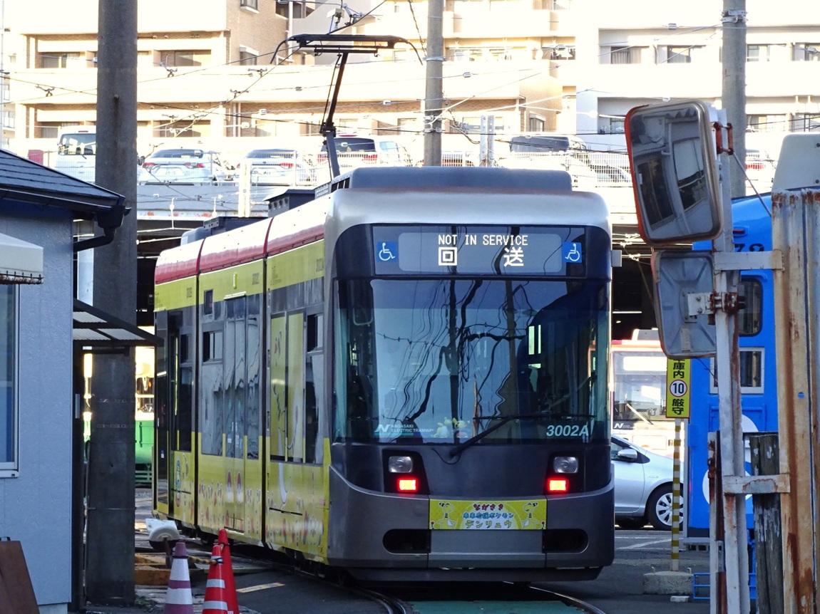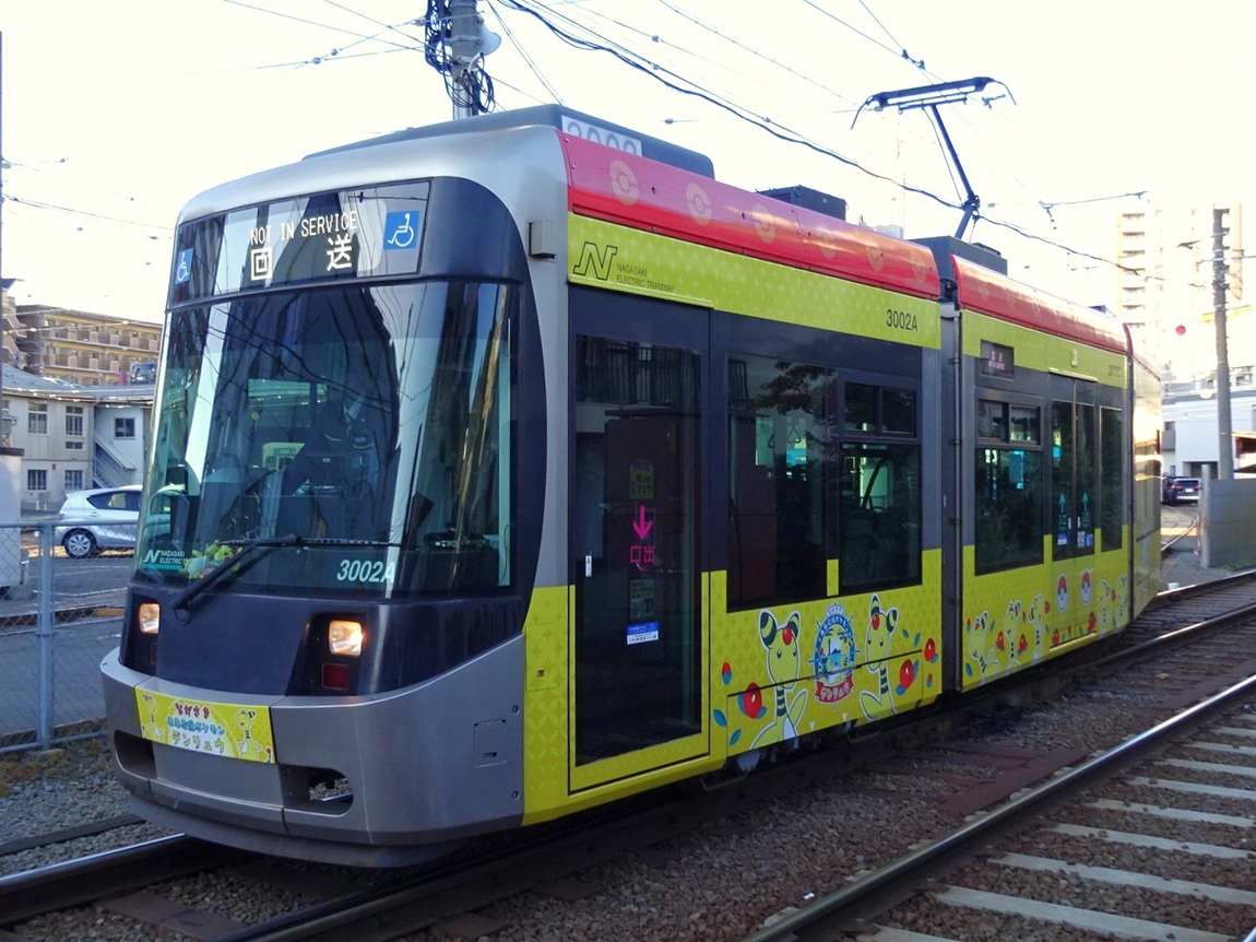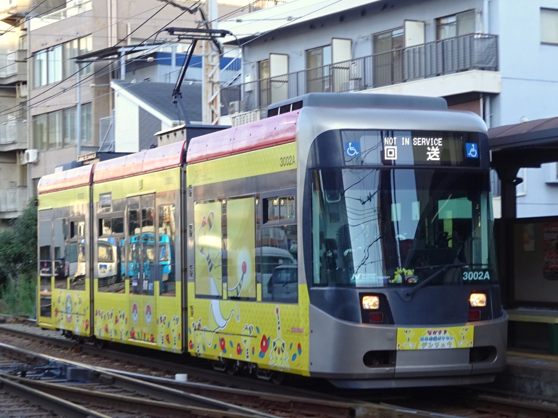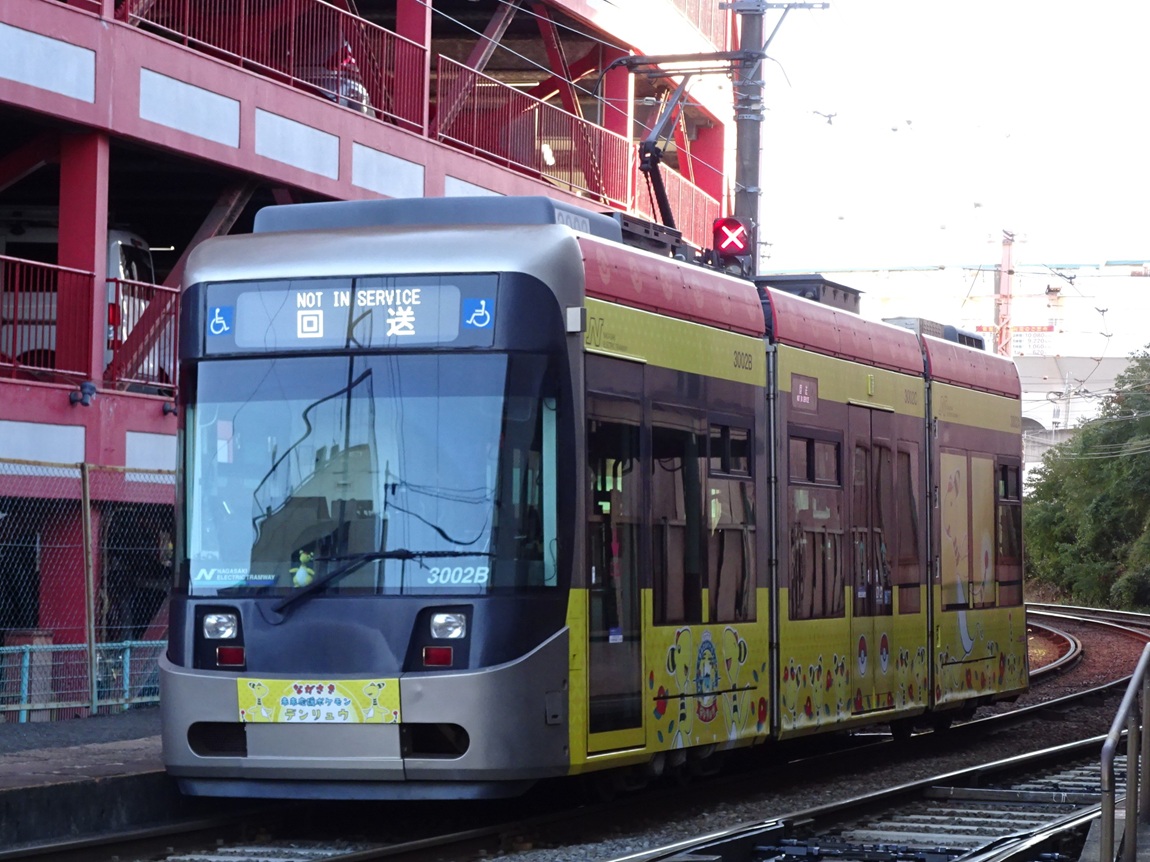 ・3000形走行音 【赤迫支線】赤迫→住吉(49秒:270KB) 走行音自体はよく聞く東洋電機のIGBTなので特別面白い音ではありませんが、ドアチャイムがなかなか変わった音をしています。真ん中の車両には動力がない(というより台車すらない)ので、収録の際はご注意。 |