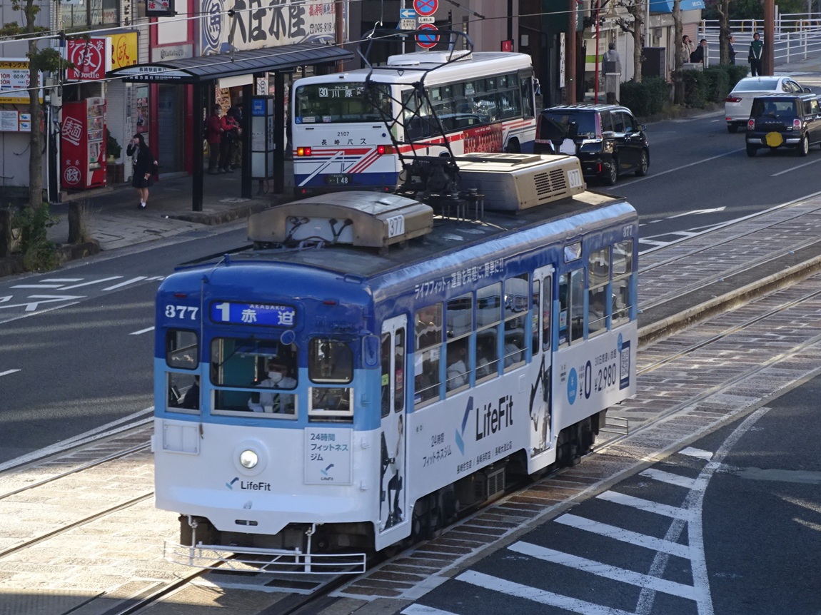 ・浦上車庫前発着集(youtube) 古めかしい車両もまだまだ目立っている長崎電気軌道ですが、吊り掛け式ながら車体は新しい車両や、バリアフリーに対応した新型車両も在籍しています。浦上車庫前で少し待ってみた間に次々やって来た車両を撮影したのですが、最後の5000形以外は全て吊り掛け車です。特に1800形は見た目が近代的なので吊り掛け式である事が意外に思えてしまいます。 本当は5000形だけ映像を分けようとも思ったのですが、モーター音があまりよく分からない映像になってしまったので纏めてしまいました。 |